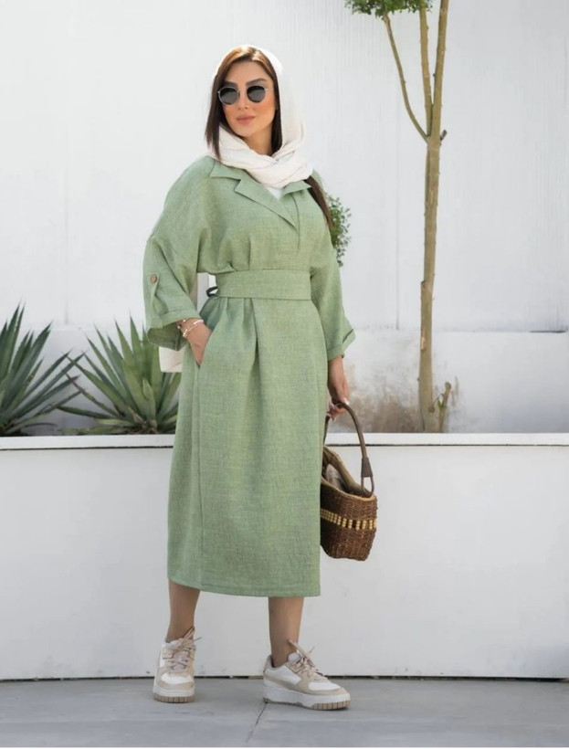 مدل بلند و مانتویی،آستین ها جمع و باز میشود،کمربند پهن و کاربردی، قد۱۲۲ ،دورسینه ۱۴۰،قد آستین از گوشه گردن ۶۶ س دکمه چوبی باز شونده،