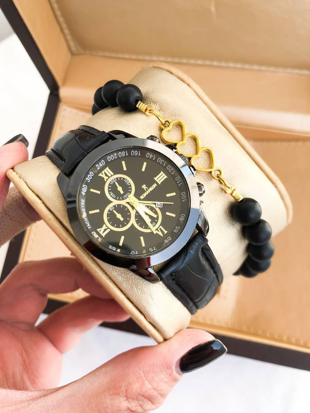 ⌚ ساعت زنانه رومانسون بند چرم مشکی + دستبند مهرهای مشکی – ترکیب شیک و جذاب!