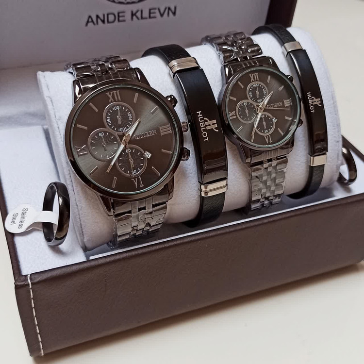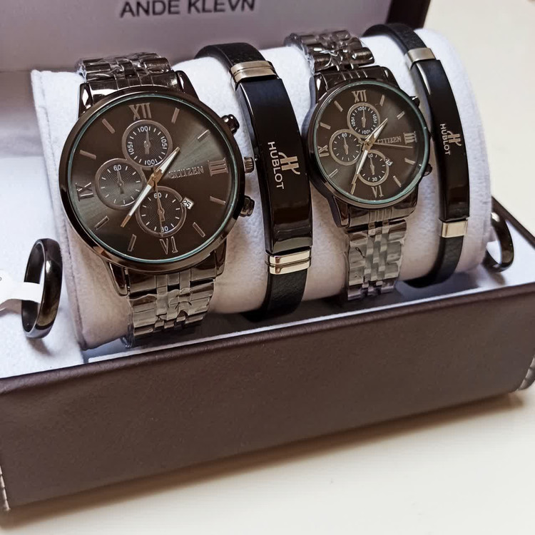 مجموعه ست ساعت سیتیزن بند استیل مشکی + دستبند + حلقه (زنانه و مردانه)