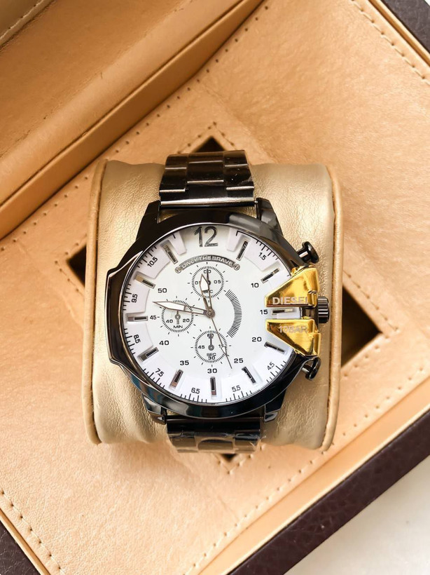 ✨ ساعت دیزل مردانه - بند استیل مشکی، صفحه سفید شاخدار طلایی 🫎✨