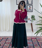 قد شومیز۵۸،دورسینه۱۰۴،آستین از سرشانه۵۴،قد دامن۹۰،کمر دامن کش